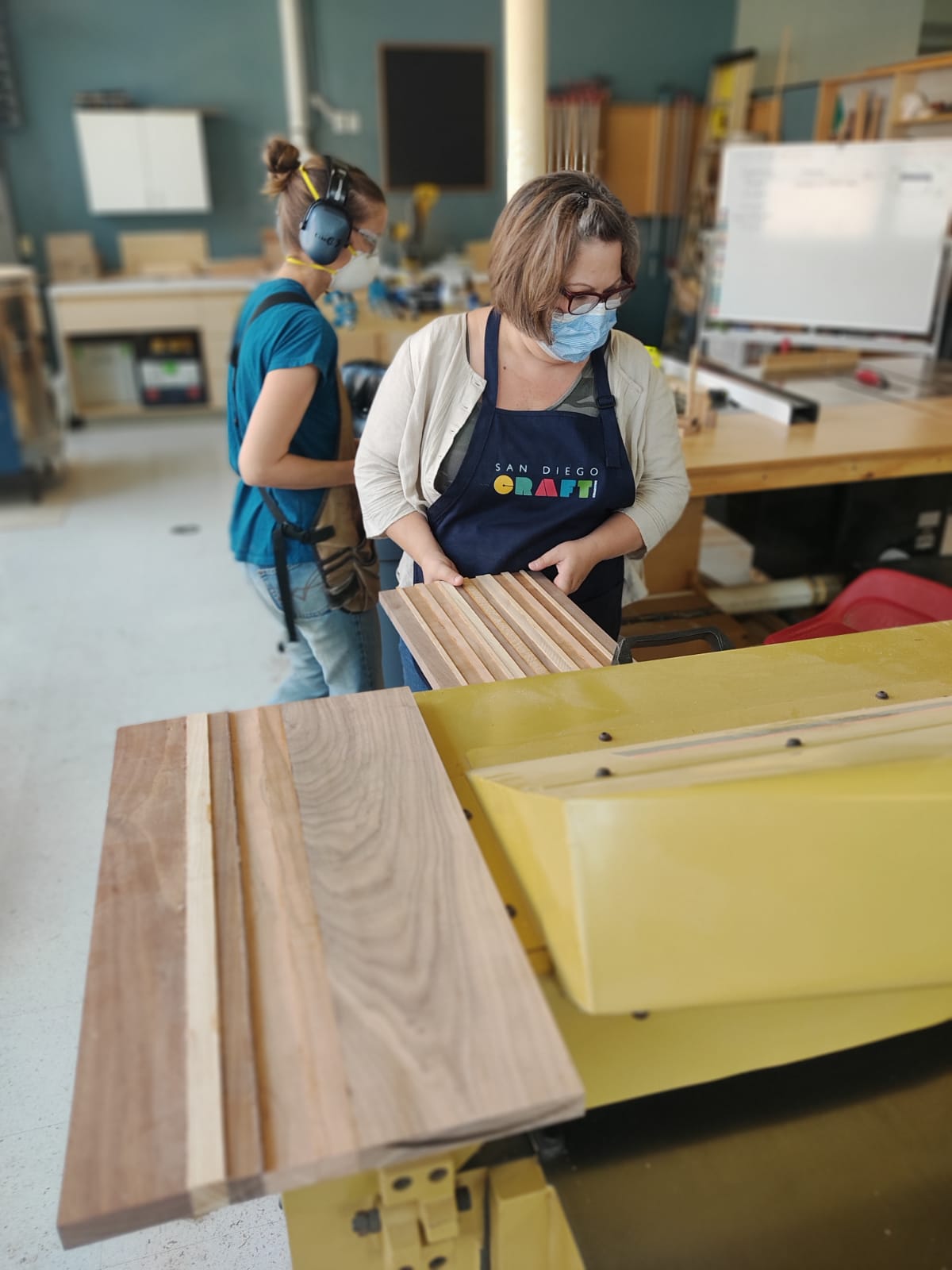 Woodworking | Intro to the Woodshop Rated 5.00 out of 5 based on 1 customer rating (1 customer review) $230.00 Select a date from the drop-down menu. No experience necessary. Ages 18+ welcome! This workshop is designed to teach students the basics of woodworking and shop safety, and serves as a strong foundation for further exploration in woodworking. In addition to what you make, our goal is for you to leave feeling more comfortable operating machinery and working in a shop environment. Students will make a cutting board, and through that process, learn how to safely use the miter saw, jointer, planer, table saw, drill press, router; as well as how to use clamps, glue up, and apply finish to their pieces. This class is a prerequisite for Woodshop Open Studio and encouraged for further woodworking classes to establish safe practices in our studio. Materials provided. • Military & first responders discounts: Email us for more information. • Scholarships available: Click here for an application. • If this class is full, join the Interest List to be notified. • If you would like to be notified of future offerings, join the Interest List to be notified when new dates or spaces are available. Choose your Date Choose an optionOct 25 & 26, 9am-1pmNov 15 & 16, 9am-1pmNov 29 & 30, 9am-1pm Student's Age Choose an option18+Clear Woodworking | Intro to the Woodshop quantity Add to cart Category: Adult Classes Tags: cutting board, DIY, furniture, handmade, learning, saw, tables, wood, woodworking, workshop Description Reviews (1) Description Woodworking | Intro to the Woodshop Select a date from the drop-down menu. San Diego Craft Collective, 2590 Truxtun Rd., Studio 106, SD 92106 • 619.273.3235 • make@sandiegocraft.org Please note this class is a 2-day workshop. This workshop is held indoors in our woodshop, so we suggest: • Dress in layers so you can adjust to the studio temperature. We work with the windows open. • Bring water/beverage if you need to be comfortable. • Wear closed-toe shoes — dropping tools on toes really hurts! • Long hair must be tied back. • Do not wear clothing with flowy sleeves and no dangly jewelry as these items can get caught on tools and machines. • An apron is recommended. You may borrow, or buy an apron in our studio. You can buy one here. DIRECTIONS: Located in Liberty Station’s Arts District, you can find our studio at the end of the hallway on the 1st floor of the Dorothea Laub Music & Arts Center (Bldg 176) at the corner of Roosevelt & Truxtun, next to The Lot movie theater. There is plenty of free parking. Parking Lot Q is behind our studio — enter via the driveway off Dewey. Across the street in the Vons parking lot, it is also free. If you can’t find us, call or text 619.273.3235. CLASS SIZE: 3 min. If the minimum is not met, you will receive a full refund or credit toward another class. REFUNDS: No refunds for tardiness or no-shows. For a refund (minus a 5% processing fee), you must cancel 7 days before the start of the class. After 7 days, we cannot offer refunds, as materials and supplies have already been purchased. TRANSFERS: You may transfer your enrollment spot to someone else, but transfers must happen before the workshop begins. Please email us to let us know who’s coming. INTEREST LIST: If a class is full or you would like to be notified of future offerings, join our Interest List to be notified when new dates or spaces are available. INSTRUCTORS FOR THESE CLASSES INCLUDE: Steffi Dotson is founder and president of San Diego Craft Collective. She completed her woodworking training at San Diego State University with a degree in Applied Design. She went on to take classes in the woodworking program at Palomar College where she later taught for several years. Her passion to elevate craft and share the skill of woodworking with others is a driving force for the direction of the programming at San Diego Craft Collective. Aleya Lanteigne (she/they) is a queer artist originally from Indianapolis Indiana, who currently lives and works in San Diego California. They are a graduate of San Diego State University (MFA-Furniture Design and Woodworking) and Herron School of Art and Design (BFAs-Furniture Design and Sculpture). They have shown work across the country, from Washington D.C to Los Angeles, and are involved in the local Arts community in San Diego. They can be found around the city teaching Contemporary Craft Workshops, installing artwork in museums/galleries, and dismantling furniture in unexpected places. 1 review for Woodworking | Intro to the Woodshop Rated 5 out of 5 Bart S. (verified owner) – May 10, 2021 Very good introductory class, I had a great time doing it! Talented instructors here at the Craft Collective and I have learned a ton in both of the classes I have taken. They do a great job meeting everyone at their skill level and making sure everyone learns and makes a great product. Highly recommended! Add a reviewYour email address will not be published. Required fields are marked *Your rating * Rate… Perfect Good Average Not that bad Very poor Your review *Name * Email * You may also like… Woodworking | Kumiko Woodworking Workshop $130.00 Select options This product has multiple variants. The options may be chosen on the product page Woodworking | Spoon Carving in the European Tradition Read more Afterschool Series | Woodworking for Kids | 6-12yrs | Mondays $45.00 – $125.00Price range: $45.00 through $125.00 Select options This product has multiple variants. The options may be chosen on the product page Woodworking | Beginner Lathe: Woodturning Workshop $110.00 Select options This product has multiple variants. The options may be chosen on the product page Woodworking for Women | Skills for the Home Woodshop $105.00 Select options This product has multiple variants. The options may be chosen on the product page Afterschool Series | Woodworking for Kids | 9-12yrs | WednesdaysRated 5.00 out of 5 $45.00 